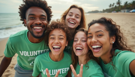 A vibrant group of five enthusiastic volunteers, showcasing a mix of ethnicities, beams with joy on a sandy beach. Their matching green shirts symbolize unity and commitment to community service, while the ocean waves and palm trees create a refreshing backdrop of positivity and hope.