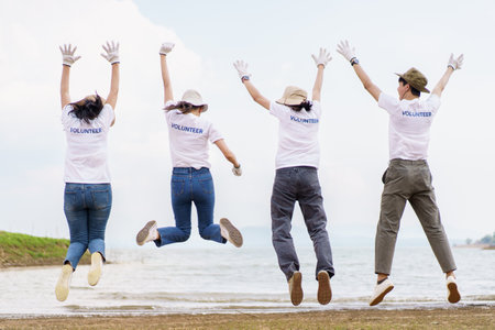 Group of Asian people volunteer stacking their hands together for collaboration and teamwork concept, volunteers helping clean up the environment around the lake and camping area.