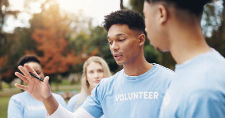 Discussion, volunteer and man with team in park together planning for sustainable green project. Collaboration, men and women in circle for outdoor management, community care or social responsibility