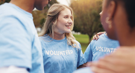 Volunteer, people and hands together in nature with smile for environmental outreach, charity or support. Happy, team huddle and collaboration for eco friendly project, social responsibility or help.