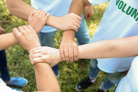 Group of young volunteers stacking hands together showing teamwork spirit. Charity and ecology concept.