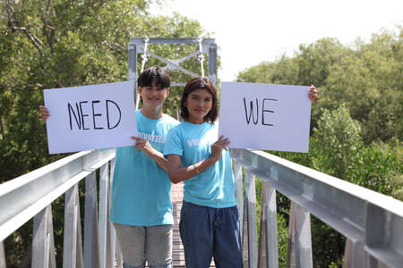 Volunteers from the Asian youth community using rubbish bags cleaning up nature par