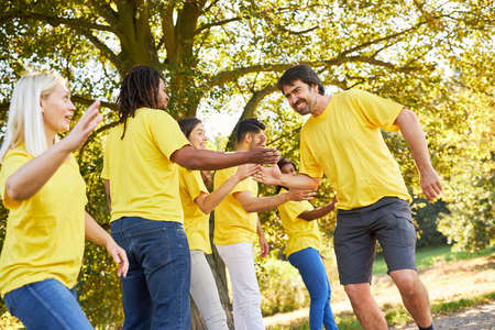 Young people and consultants with clipboard during an outdoor game in team building workshop