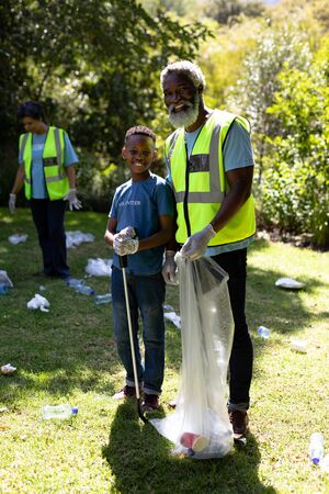 Senior African American man spending time outside with his family, embracing his grandson, looking at the camera and smiling, wearing blue volunteers t shirts, collecting garbage, holding a garbage bag, on a sunny day