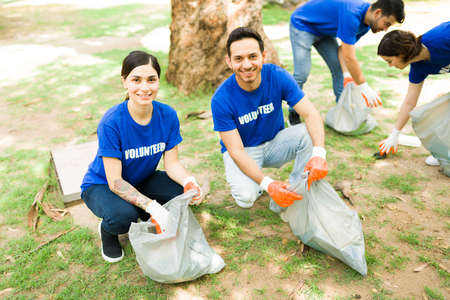 Portrait of an attractive young couple volunteering together to clean a dirty park. Hispanic people collecting litter outdoors