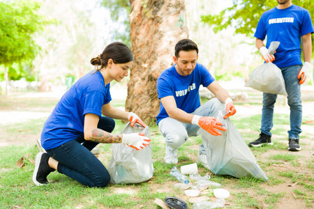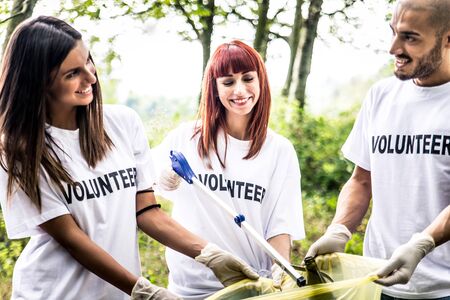 Group of volunteers volunteering and cleaning up trash and plastics to recycle from park.