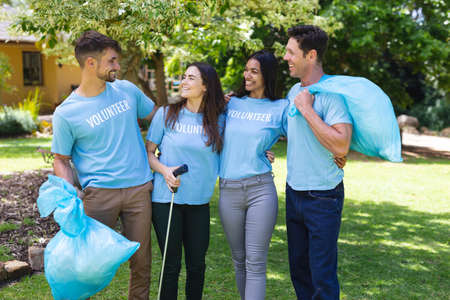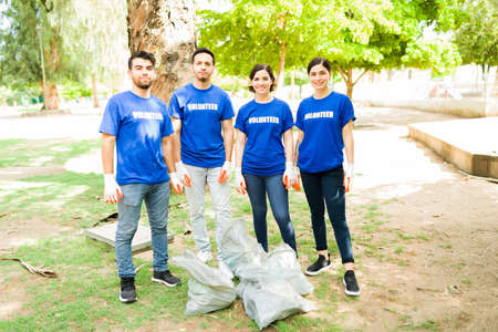 Multiethnic volunteers donate their time holding black garbage bags to collect plastic waste for recycling to reduce pollution in a public park