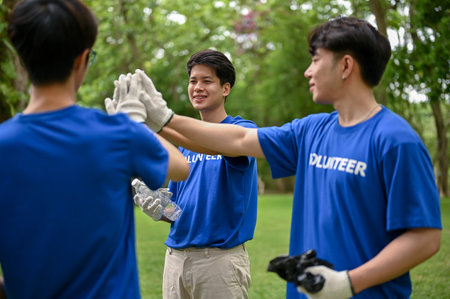 A group of cheerful young Asian volunteers join hands together or give high fives to cheer each other up, getting ready to work as volunteers.