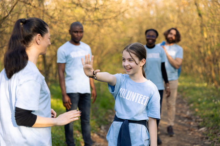 Activist congratulating a little child with a high five gesture, praising her team members after a job well one volunteering to help nature ecosystem. People showing perseverance.