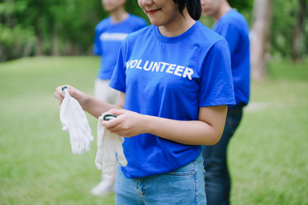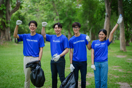 Volunteers from the Asian youth community using rubbish bags cleaning up nature par