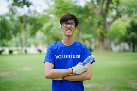 Young Asian Volunteers with garbage bags cleaning park area. Ecology, Charitable organization concept