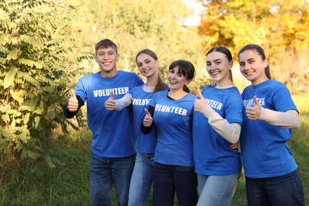 Group of happy volunteers showing thumbs up in park