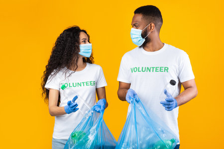 Volunteers Holding Plastic Bottles And Garbage Bags On Yellow Background