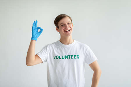 Cheerful young volunteer guy in white t-shirt and gloves showing OK gesture and smiling at camera