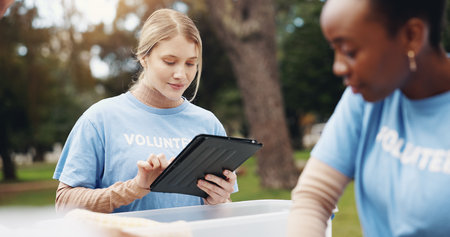 Tablet, volunteer and people in park for checklist at charity event, community service and teamwork. Volunteering, ngo group and women on digital tech for social media, website and online inventory