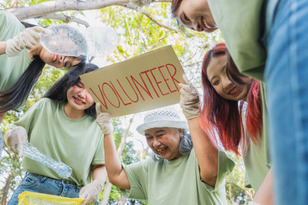 Volunteers of various nationalities are showing solidarity, donating their personal time, holding black trash bags to collect plastic waste for recycling to reduce pollution in a public park