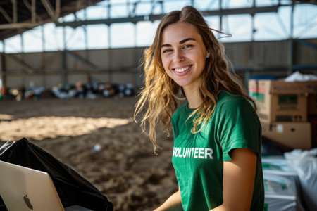 Cheerful young woman volunteer in green shirt working at warehouse, assisting with organization and distribution tasks. Community service