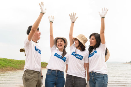 Group of volunteers holding rubbish bags collecting plastic bottles in bags. clean up garbage in tourist attractions. Conservation and care cleanliness in nature.