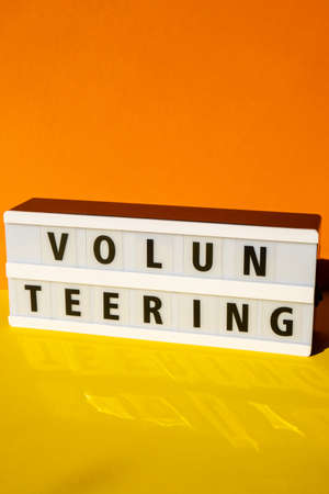 Lightbox with text VOLUNTEERING. Motivational Words Quotes Concept. colorful yellow background. Minimal creative concept. Donation support