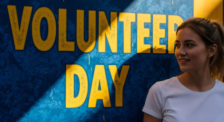 Woman posing near a vibrant blue sign with yellow lettering saying volunteer day, celebrating the international volunteer day and humanitarian concept.