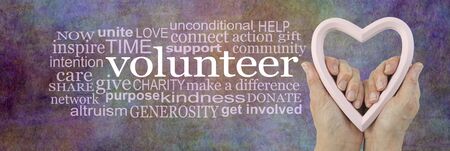 Volunteering is an act of LOVE Word Cloud - female hands holding a pale pink heart frame next to a VOLUNTEER word cloud on a multicoloured rustic stone effect background