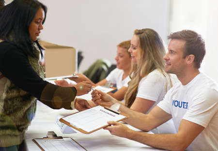 Just sign right here. Cropped shot of volunteer getting signatures for church donations.