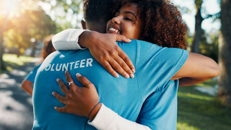 Volunteer, smile and hug with people in park for recycle program, earth day or social responsibility. Environment, climate change and ngo with friends in nature for non profit, support or charity