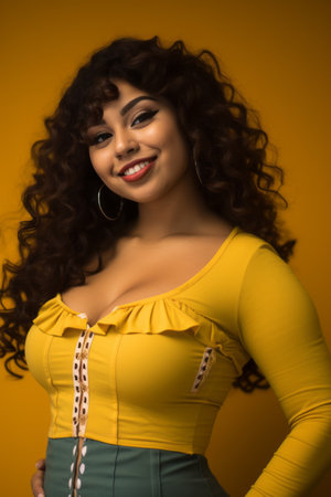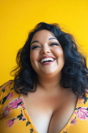 Portrait of a cheerful curvy hispanic woman laughing on a yellow background
