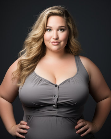 Plump plus size model smiles at the camera and proudly shows off her body. AI generated.