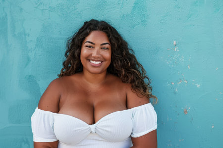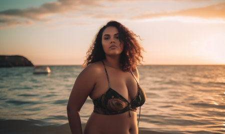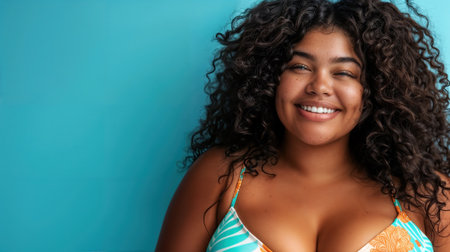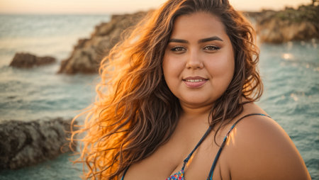A radiant plus-size woman in colorful beachwear enjoying a sunny day at the beach. Her confident smile and natural beauty shine against the backdrop of the ocean waves and a bright blue sky. This image celebrates body positivity, self-confidence, and the joy of summer vacations