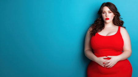 A plus size model stands confidently with her hands on her waist wearing a red dress. She has long hair and bold makeup, showing body positivity.