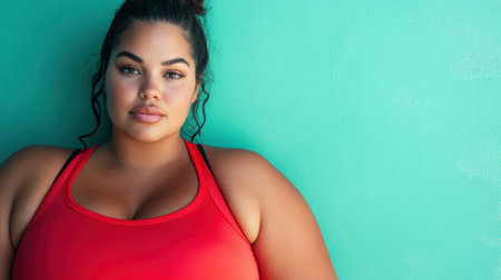 Curvy woman wearing red top leaning against a wall, A realistic portrayal of a curvy woman with a radiant smile