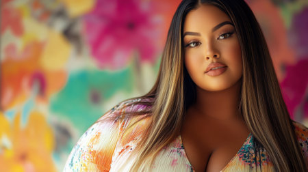 Confident plus-size woman in a bright floral dress, posing against a colorful graffiti wall. Embracing body positivity, self-love, and vibrant urban culture.