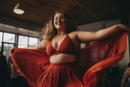 Happy and self-confident plus size woman is dancing in a red dress.