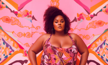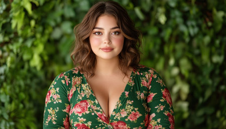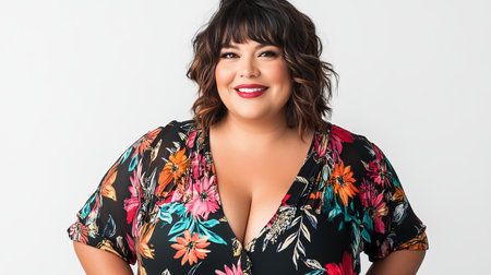 A radiant plus-size woman, adorned in a vibrant floral dress, exudes confidence and self-love Her pose radiates empowerment, celebrating her curves and embracing her beauty This captivating image embodies body positivity, showcasing the elegance and style of plus-size fashion AI Generative