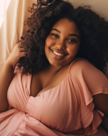 Close up of a joyful plus size African American young woman laughing with a light pink color background. Generative AI