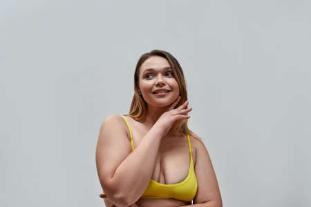 Portrait of beautiful curvy young woman wearing yellow underwear smiling aside, posing isolated over grey background