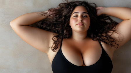 Relaxed Plus-Size Latina Model with Long Straight Hair in Stylish Clothing