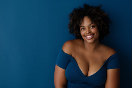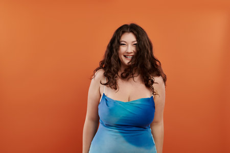 A joyful young plus size woman poses confidently in a blue dress, standing out against a vibrant orange backdrop.