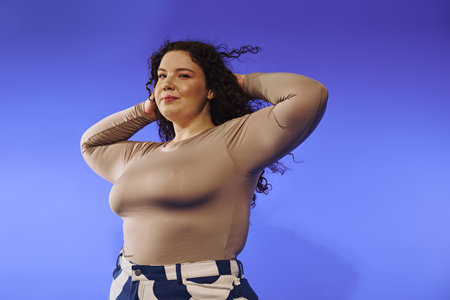 A confident plus size woman stands with hands in her hair, exuding self assurance in her outfit.