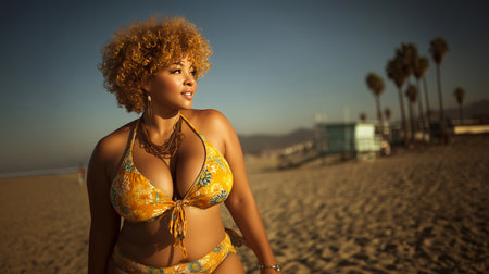 Curvy woman in a yellow bikini enjoying the sunlight on a warm beach. Symbol of happiness, inclusion, and self-assuredness.