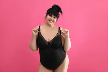 Beautiful overweight woman in black underwear on pink background. Plus-size model