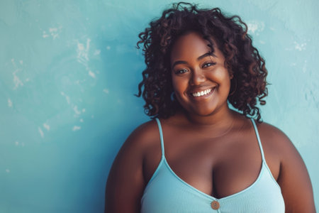 Smiling plus size woman against a colorful wall.