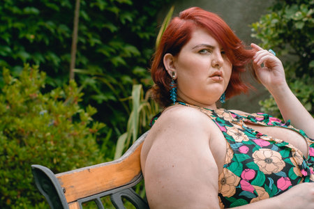 Plus size model posing confidently in tropical garden setting