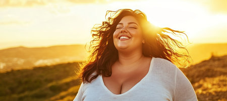 Carefree plus size female model is feeling the warmth of the setting sun on her face, enjoying freedom and body positivity