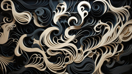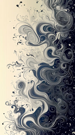 Delicate swirling patterns with smooth curves and intricate designs fill the space, showing a beautiful interplay of black and white tones in a stylish, artistic composition.