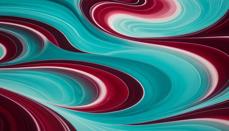 A striking abstract composition with swirling spirals and curves in shades of red and turquoise against a golden backdrop.. AI Generation