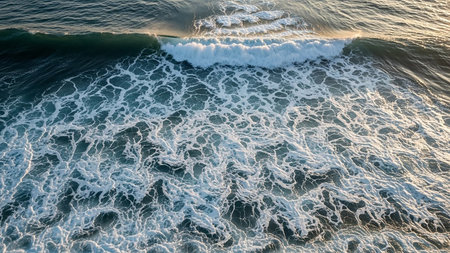 An aerial perspective showcases ocean waves in shades of deep blue and white foam. The image captures the movement and texture of water, with visible patterns of waves. This composition, likely taken from above, depicts a dynamic scene suitable for various commercial and editorial applications, emphasizing natural elements.