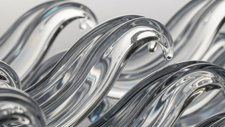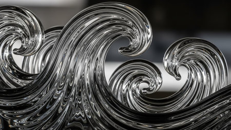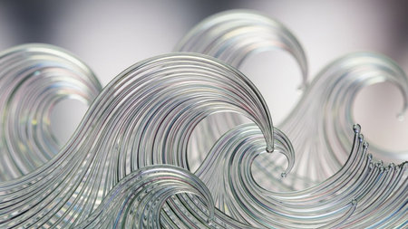 Delicate transparent glass strands form swirling wave shapes with subtle iridescent refractions against a soft,...