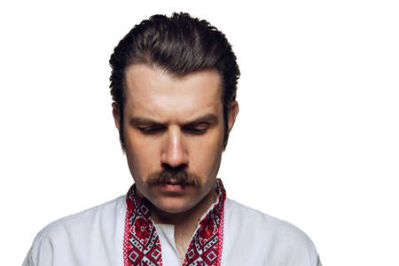 Portrait of sad concentrated man with moustache looking down, wearing ukrainian national cloth - embroidery shirt isolated over white studio background